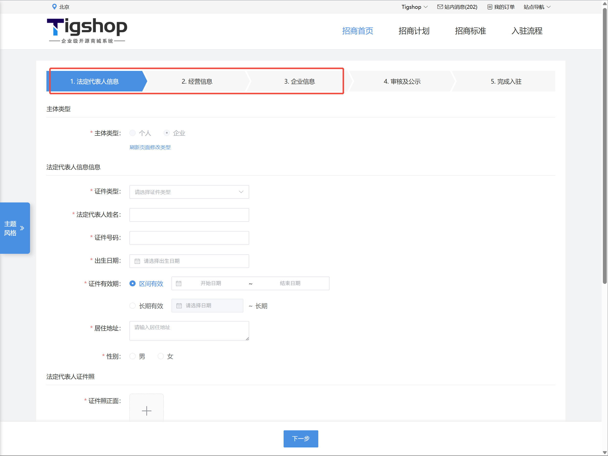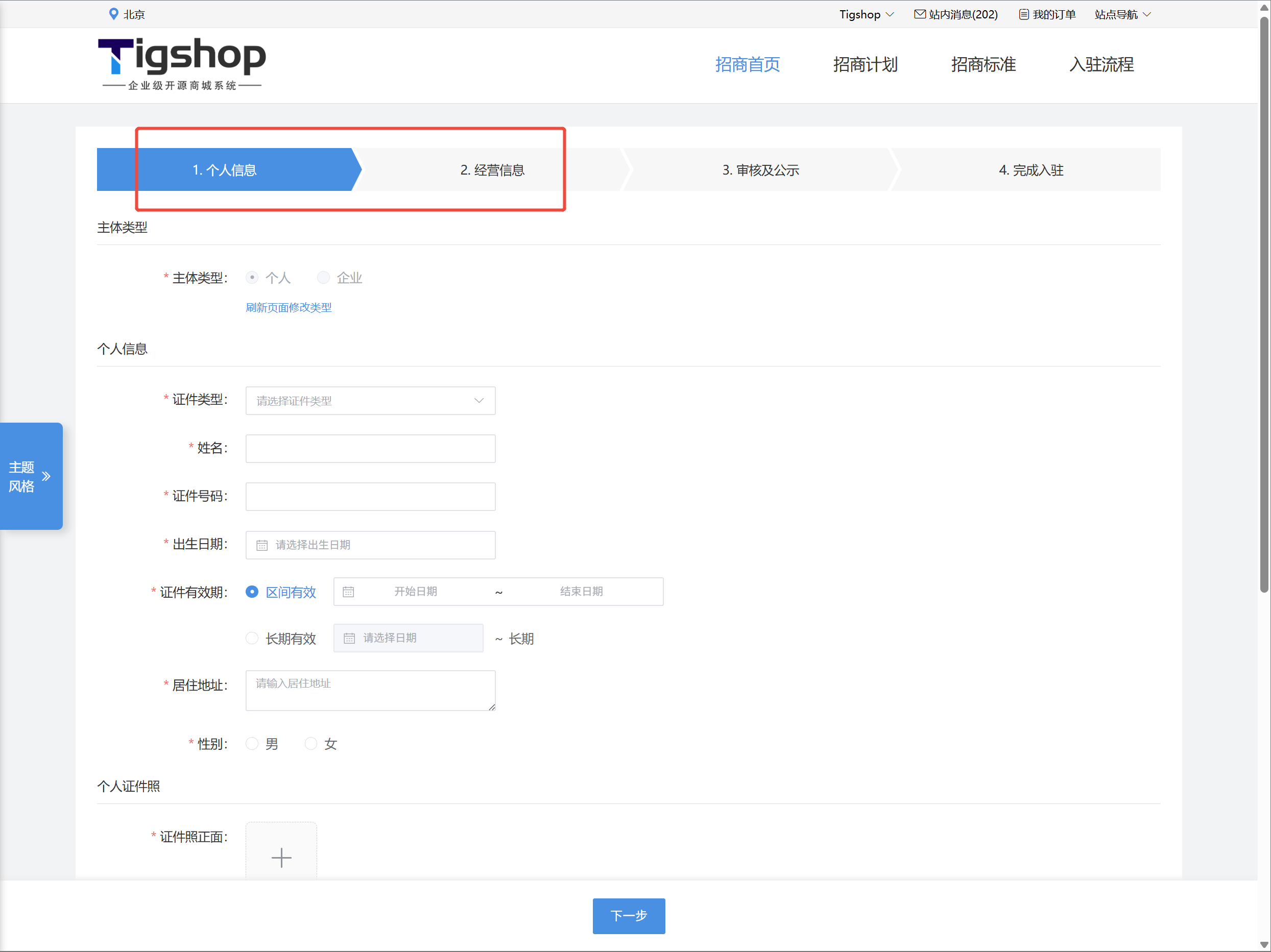 登录商城PC端前台,点击商家入驻即可直接开始填写入驻申请,也可在右上方查看商城招商首页、招商计划、招商标准、入驻流程后填写入驻申请