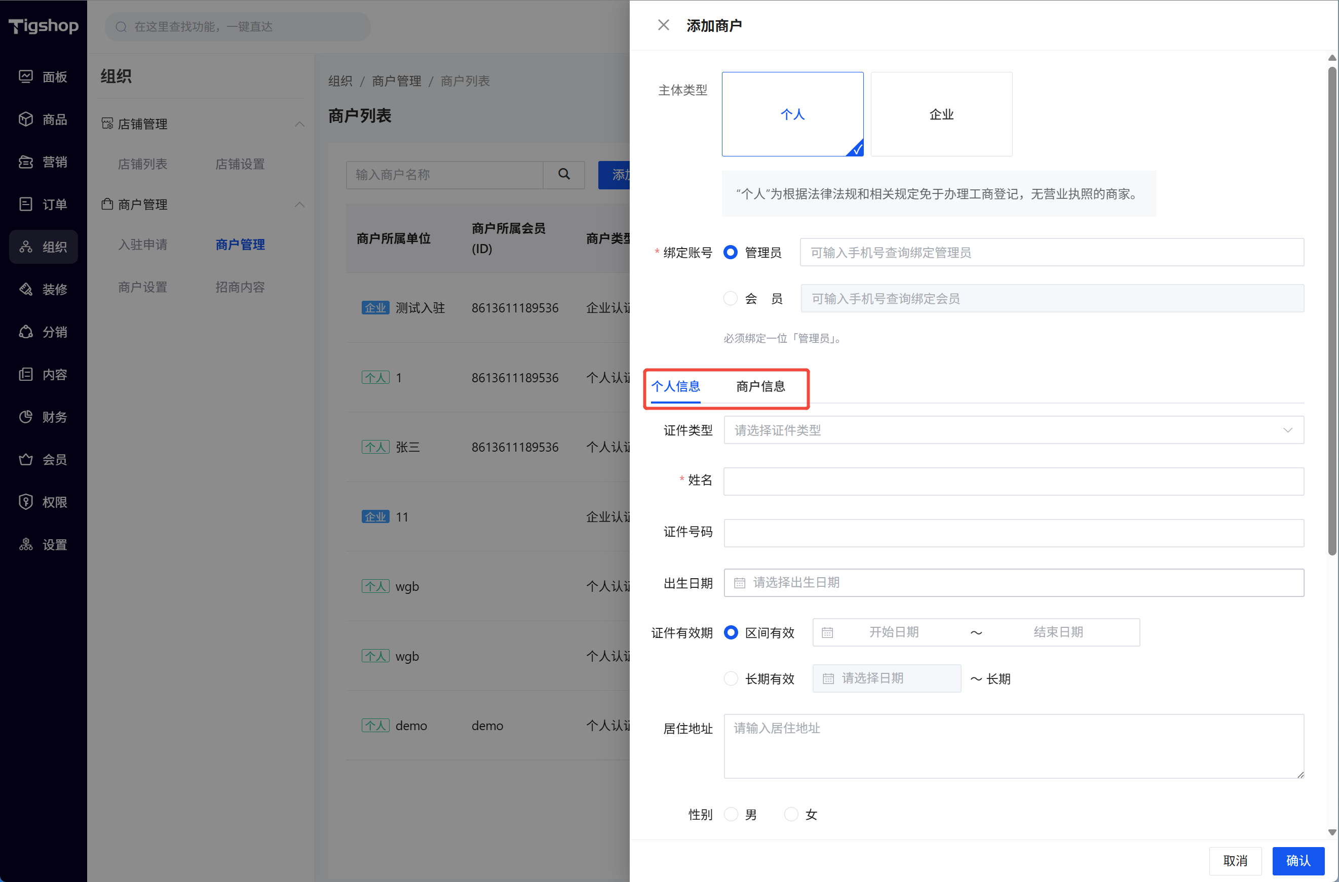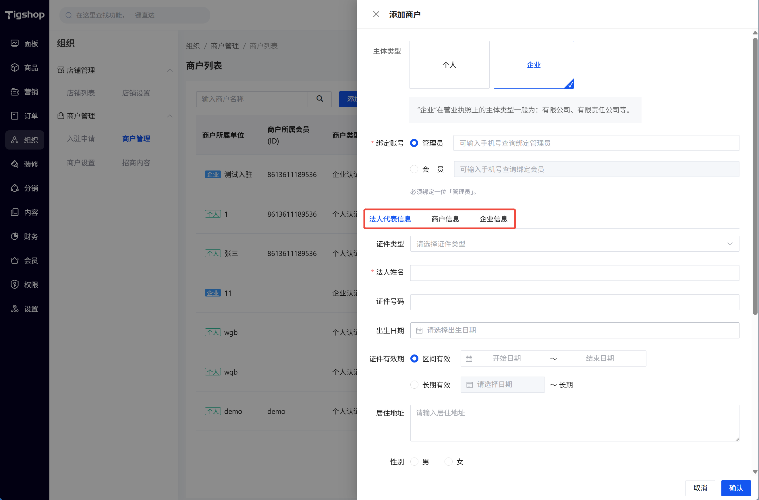 登录商城后台-组织-商户管理-商户列表-添加商户