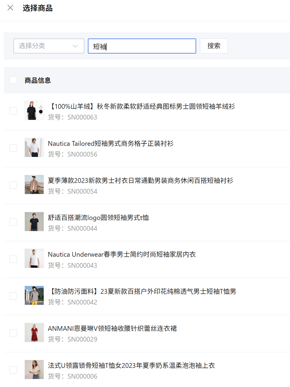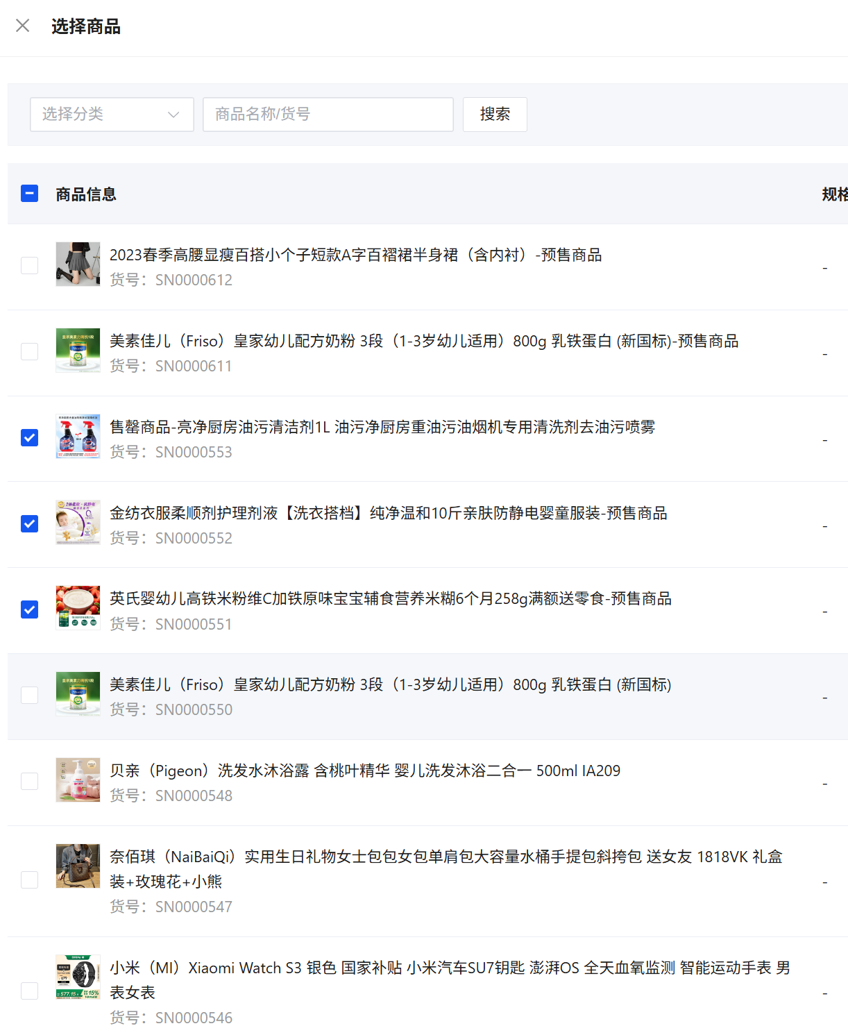 - 可以根据商品名称/货号搜索选择。